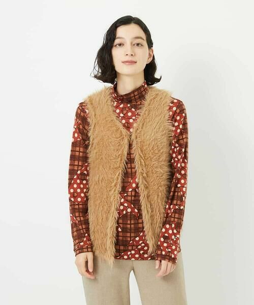 秋冬のトレンド、ファーベストをニットで表現しました。V開き衿に前後差をつけて、細見え効果のある縦長シルエットに仕上げました。カギホックがついているので閉じることで雰囲気を変えることができます。ボリューム感を抑え、コートインでもすっきりとお楽しみいただけます。