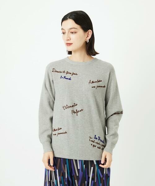 筆記体のロゴが散りばめられた、大人の遊び心擽る着映えニット