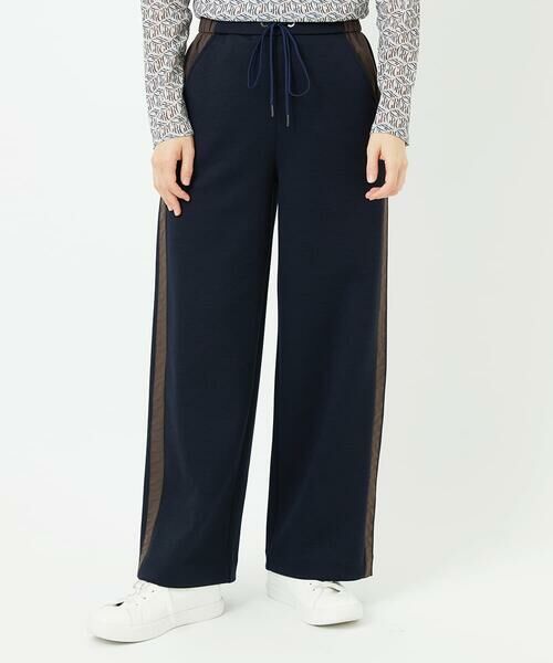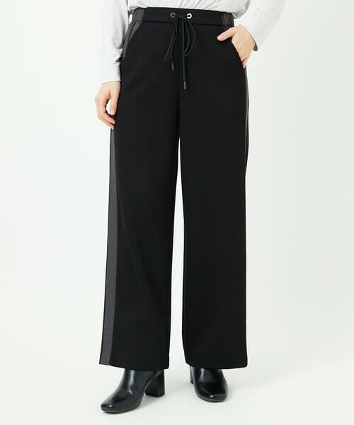 ストレートワイドシルエットのウエストゴム+コードで調整できるパンツです。ウエストはオールゴム仕様でストレスフリーな穿き心地です。ウエストはコードでお好みの大きさに調整できるのもポイント。サイドラインとポケット、後ウエスト部分に配色タフタを使用し、コーディネートのアクセントに。シンプルなデザインなので無地感覚で様々なアイテムに合わせていただけます。