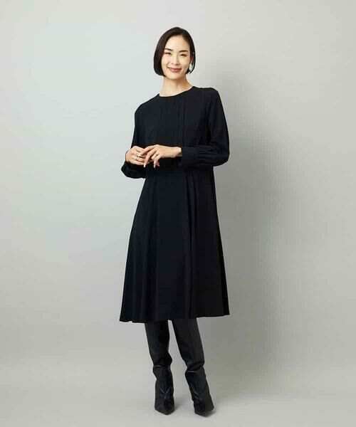 Maison de CINQ / メゾン ドゥ サンク ロング・マキシ丈ワンピース | [小さいサイズ]ノーカラープリーツワンピース(ネイビー)