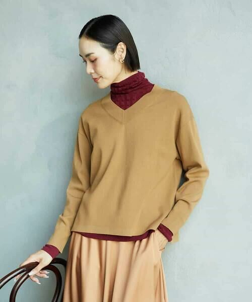 幅広のリブ襟がアクセントになったシンプルなニットプルオーバー。浅めのVネックが安心感ときちんとした印象を与えます。