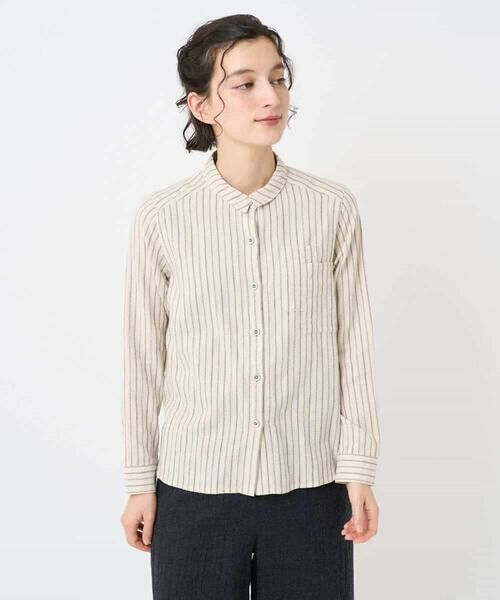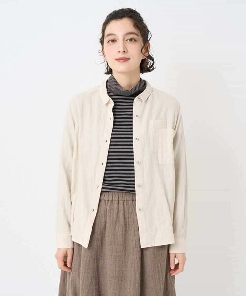 ジャンニロで定評のある小さめのシャツカラーで、ニットなどのインナーから羽織りとしても使用できる合わせやすいデザインを新しく起毛シャーリング素材で作りました。左胸のWポケットがアクセントとなっている可愛らしいカジュアルな印象のブラウスに仕上げています。