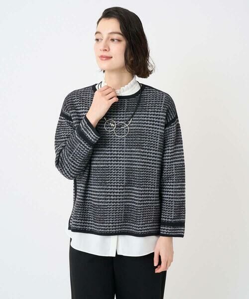ループヤーンを交編し立体感のあるチェックジャカードニットです。クラシカルなグレンチェックに肩やアームホール、脇に施したラインが全体を引き締めるアクセントになってくれています。ゆったりとしたシルエットにコンパクトな7分袖で、インナーを重ねやすいレイヤーニットです。ふんわり感がありながらも、ショート丈なので低身長や小柄な方でも着こなしのバランスを取りやすいアイテムです。