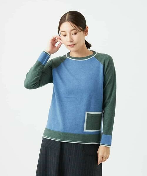 身頃、袖から衿、裾、袖口と3色をバランスよくカラーを使い合わせたニットは存在感抜群。さらに身頃の下にあるポケットがアクセントとなっています。