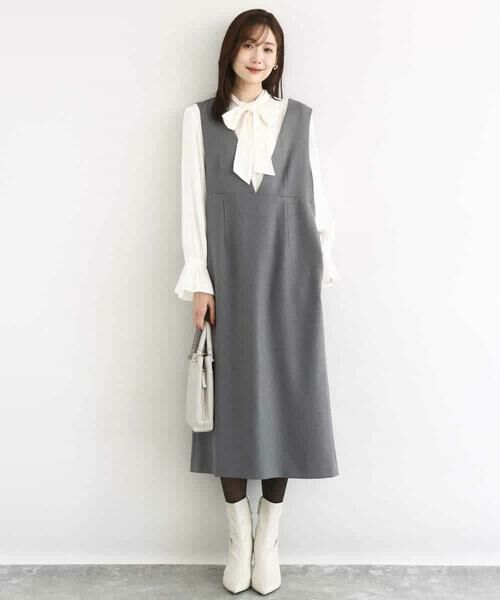 深めのV開きとストレートなシルエットで、すっきりと大人っぽく着こなせるジャンパースカート。後ろの開きを浅めにすることで、肩から落ちづらくなっています。