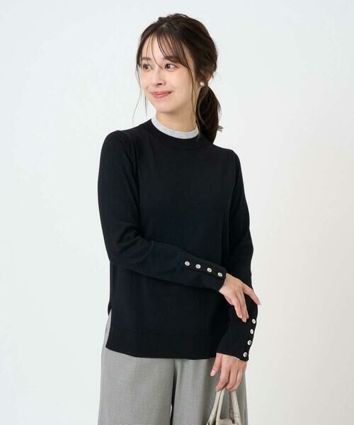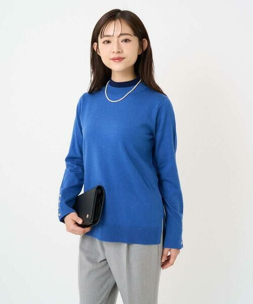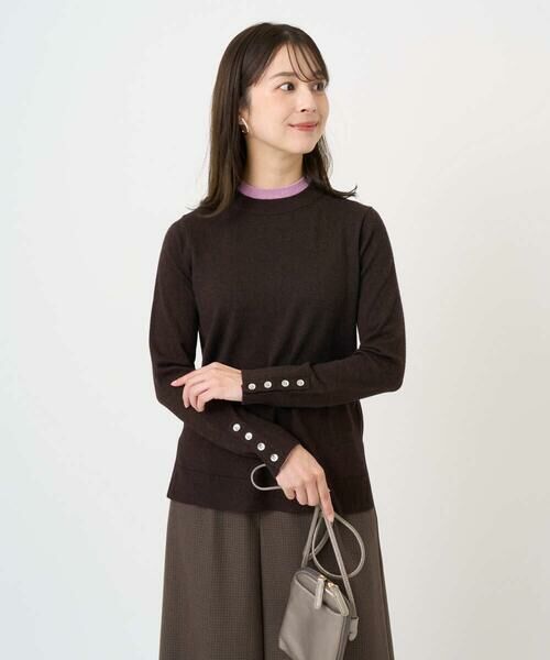 襟ぐりと袖口の配色デザインがポイントのニットプルオーバー。毎年人気のニットですが、今季は襟をやや低めにし、より着やすいデザインにアップデートしました。袖口は配色&メタル釦でアクセントに。釦の開け閉めで見せ方をアレンジできます。