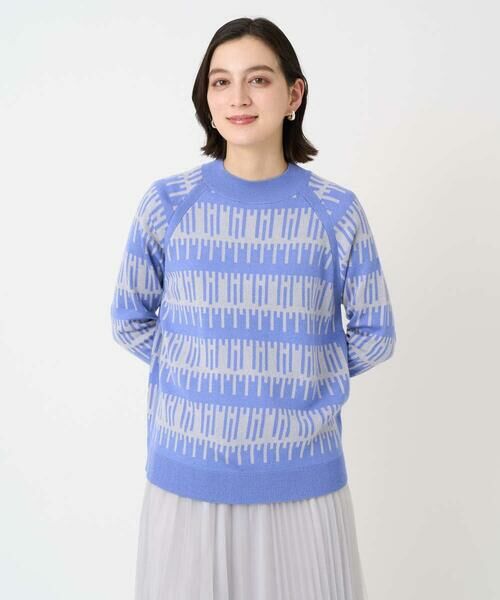 インパクトのあるジオメトリック柄をボーダーで表現したジャカードニットです。脇からラグランラインにかけてテープ状の配色を施し、袖口のリブ部分にもインターシャで配色を加えました。ほどよくゆとりのあるボディラインを拾いにくいサイズ感となっています。窮屈感のないセミハイネックデザインで上品で洗練された印象を与えてくれます。