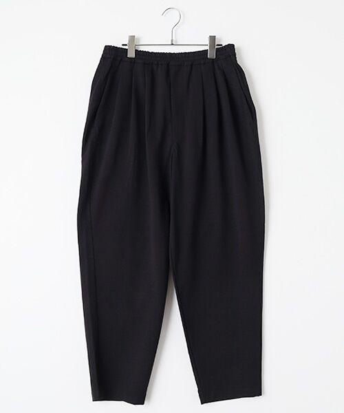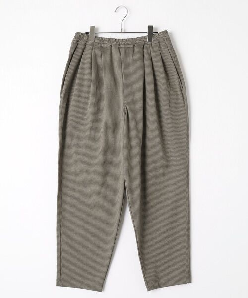 ストライプシアサッカージャージーを用いたイージーパンツ。腰回りにタックを3本細かく配置することで、立体的で綺麗なラインを実現。裾はテーパードさせて緩くなり過ぎないようにシャープなイメージに仕上げています。脇線にはカットソー専門のファクトリーブランドならではの振りミシンのステッチを施してさりげないアクセントに。ウエストはドローコード付きエラスティックバンドのイージー仕様。