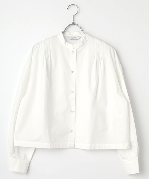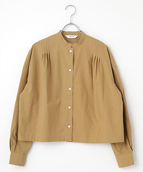 肩のプリーツや袖のタックが立体感を生む、個性のあるデザインに仕上げたシャツ。