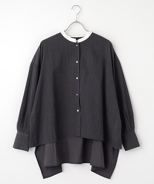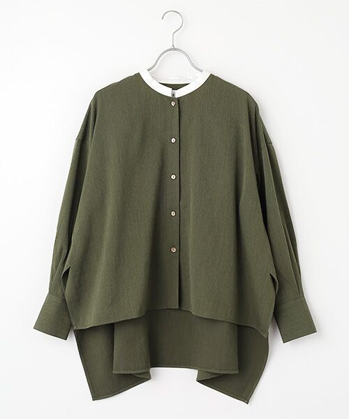 首元のクレリックデザインが印象的なバンドカラーシャツ。