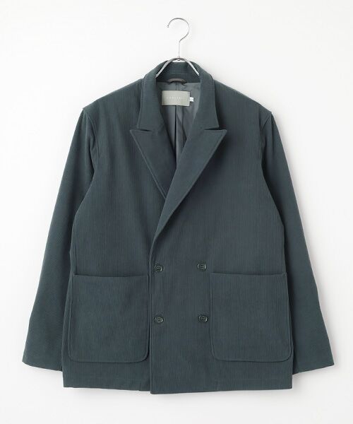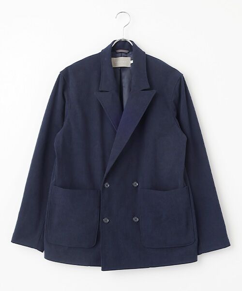 トリコット素材のポリエステルコーデュロイを用いたセミピークドラペルの4ボタンダブルブレステッドジャケット。ビジネスシーンでもタウンユースでも両用できるよう適度なゆとりのあるボックス型シルエット。布帛のコットンコーデュロイと比べると野暮ったくなくスッキリと見え、通常のパイルカットコーデュロイと異なり毛房が抜けることも無いのでお手入れも簡単。適度な張り感があるのでボタンを外して着用する時もシルエットが崩れることなく綺麗に保てます。ポリウレタン未使用ながらナチュラルなストレッチ性を持たせているので、ストレスフリーな着心地。