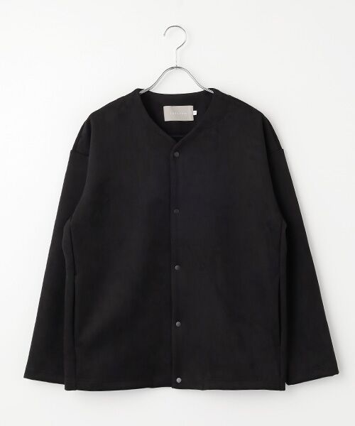 リサイクルポリエステル原料のダンボールスエードを用いたスナップボタン仕様のカーディガン。数シーズン定番アイテムとして展開しているデザインを今季はスエード調のダンボールニットにて製作。レザーの様な見え方はコーディネートのアクセントになりながらも、メンテナンスも気にする必要がなく取り扱いが楽。裏面は表側と違って起毛せずにツルッとしているので袖入れの滑りも良く、ポリウレタン配合により伸縮性に優れているので着心地は抜群です。カフスや裾のドットボタンを閉めれば丸みが出るので、シルエット変化を楽しむ事ができます。ウエスト部分にはシームポケット有り。