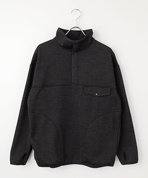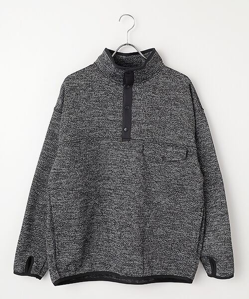 裏起毛が施されたポリエステルニットを用いたチムニーカラーのアノラック。表面は縦畝のざっくりとしたニットで裏面は起毛加工された暖かいフリース。2枚をボンディングするのではなく編み方や加工を工夫し布1枚で表現しているので、圧倒的な軽さを実現。アノラックのエッセンスを取り入れながらもフードではなくスタンドカラーを採用。広めの天幅と浅めの前下がりが特徴の平面的でレトロな雰囲気に仕上げています。フラップ付きの胸ポケットとウエスト部分にはシームポケット有り。