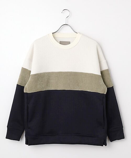 3色を切り替えたダブルフェイスジャージーのクルーネックプルオーバー。前身頃だけでなく後ろ身頃も袖も全て切り替えたダイナミックなデザインは、ノルディックセーターとラガーシャツからインスピレーションを受けて抽象化したもの。ダブルフェイス素材の特徴を活かし部分的に表面と裏面を使い分けることで、起毛されたモール糸の柔らかい表情が強く引きでています。形はシンプルな程よいゆとりのあるシルエット。ウエスト部分にはシームポケット有り。