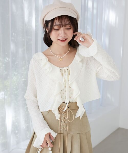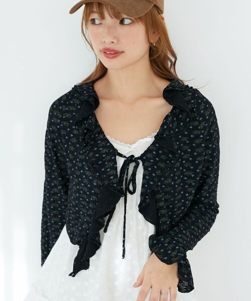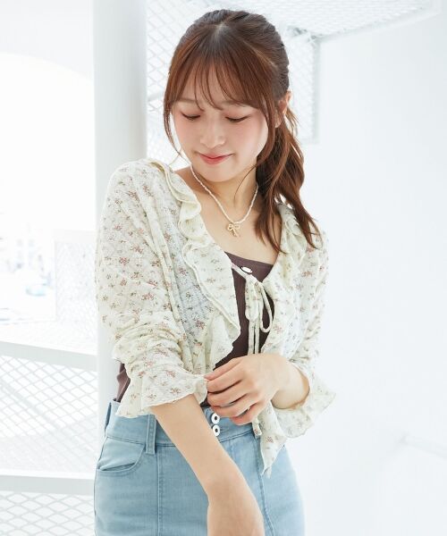 襟のフリルと花柄がポイントのカットソーカーディガン