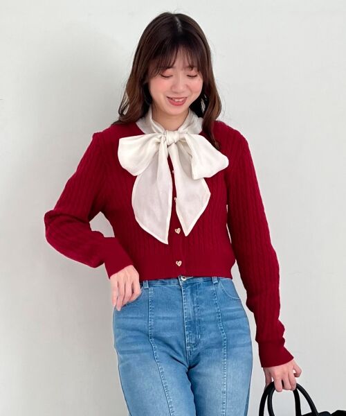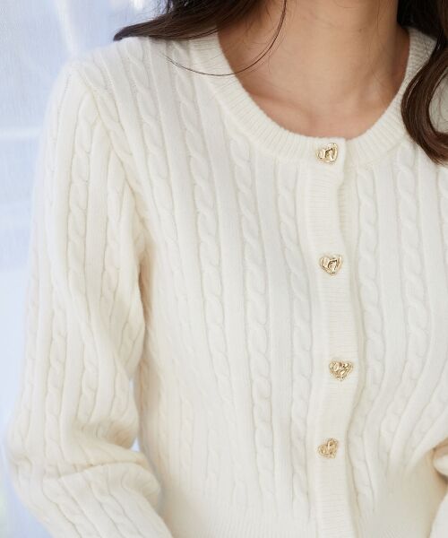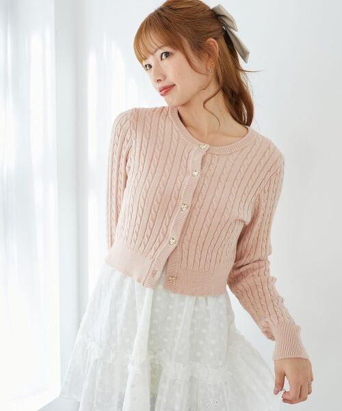 着丈短めのボクシーでコンパクトなシルエットのミニケーブルニットカーディガン。