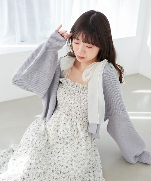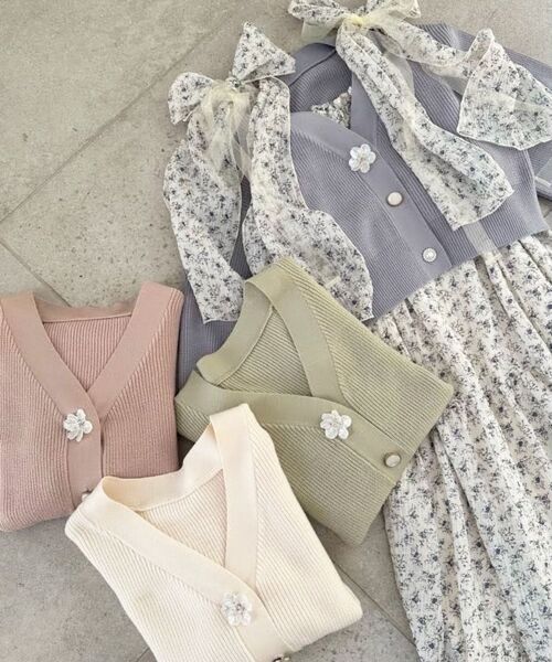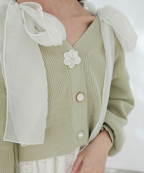 印象的な立体フラワーモチーフとビジューボタンがいつものコーデをクラスアップしてくれるカーディガン。
