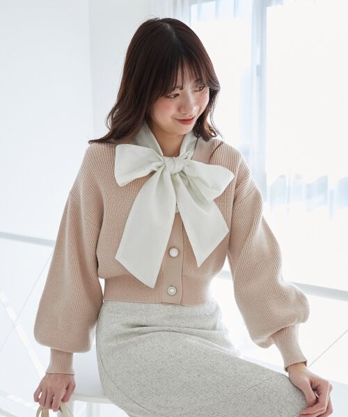 パールのようにきらめく乳白色の花モチーフと、上品に輝くビジューボタンが着るだけで華やかな印象に仕上げてくれるカーディガン。