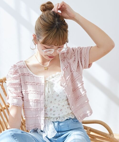 レースのようなフリルのカットソー生地を使った、可愛さも着心地も満点のよくばりトップス。