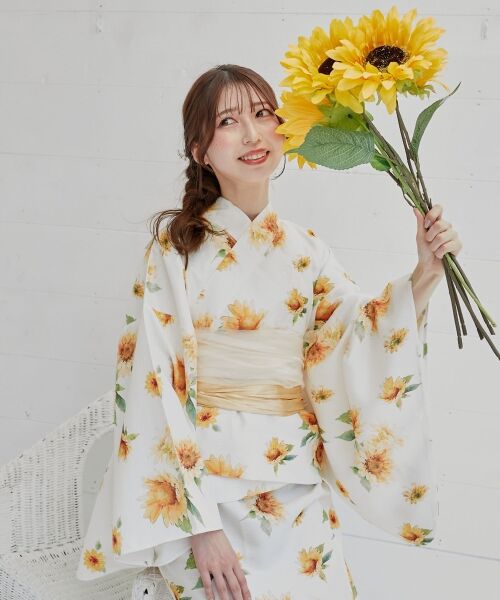 イエロー柄:白ベースにひまわり柄×ひまわりイエローのサテン帯×アイボリーのオーガンジー帯で明るく夏らしい印象に