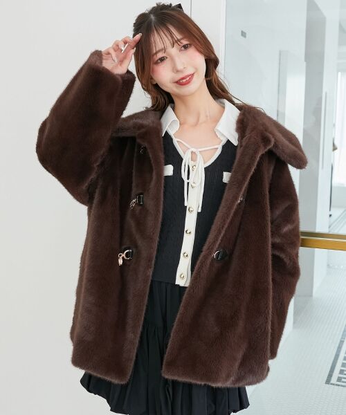 大きめ襟とゴールドトグルが目を惹くフェイクファーコート
