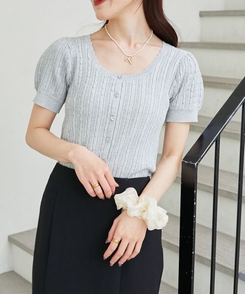 同色のハートボタンや襟元のスカラップデザインで程よく甘さをプラス。