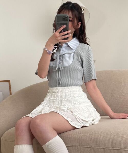 シャツとニットをレイヤードしたかのような上品プレッピーなデザイントップス。