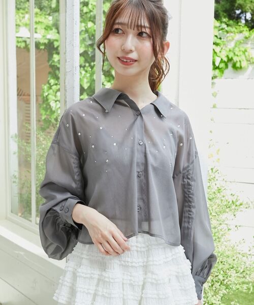 キラキラと輝くラインストーンとバックギャザーフリルで全方位カワイイ!シアーシャツ