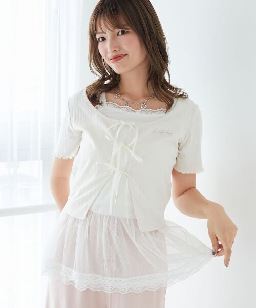繊細なレースをキュートなペプラムデザインに仕立てたキャミソールと、フロントのリボンがポイントになったカットカーディガンのセットアイテム。