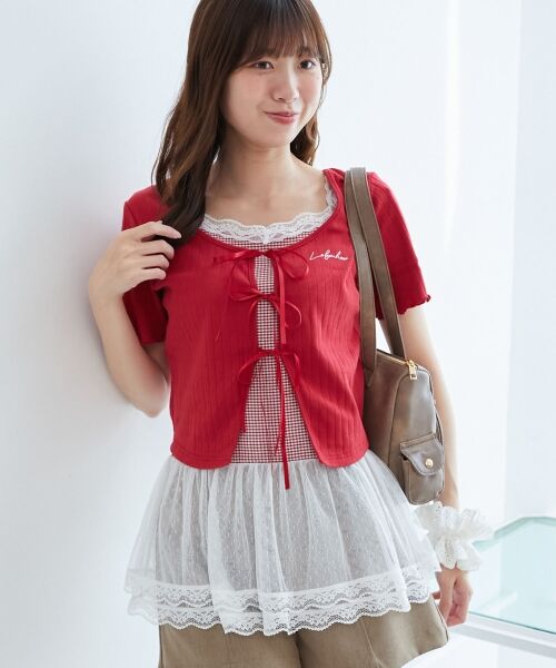 [レッド柄]カーディガン:本体/綿100% 刺しゅう糸/ポリエステル100% リボン/ポリエステル100% キャミソール:本体ポリエステル95% ポリウレタン5% チュール/ポリエステル100% レース/ナイロン90% ポリウレタン10%