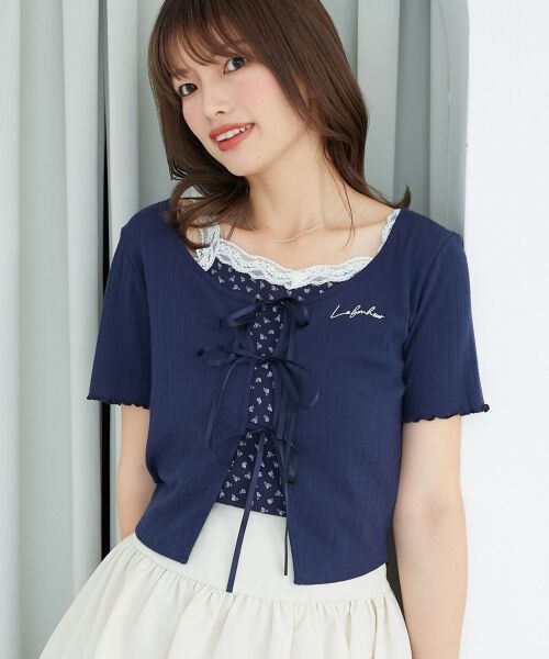 [ネイビー柄]カーディガン:本体/綿100% 刺しゅう糸/ポリエステル100% リボン/ポリエステル100% キャミソール:本体/綿90% ポリウレタン10% チュール/ポリエステル100% レース/ナイロン90% ポリウレタン10%