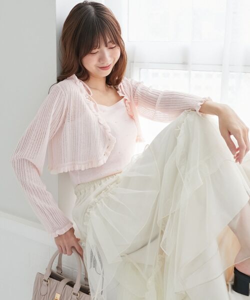 カーディガンは襟端と袖口にフリルを施し、ガーリーな印象をプラス。