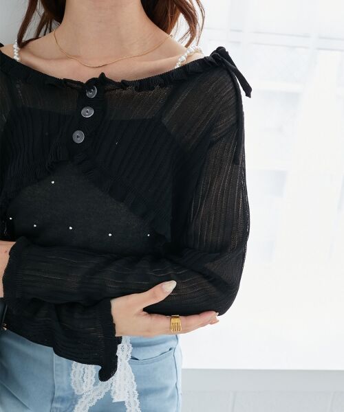 パールチェーン&ビジューのきらめきがシーズンムードを漂わせるキャミソール&シアーカーディガンセット