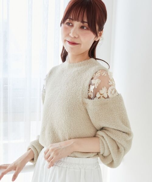 肩のシアーレースの切り替えが印象的なニットプルオーバー。