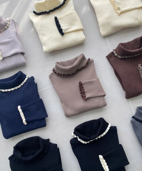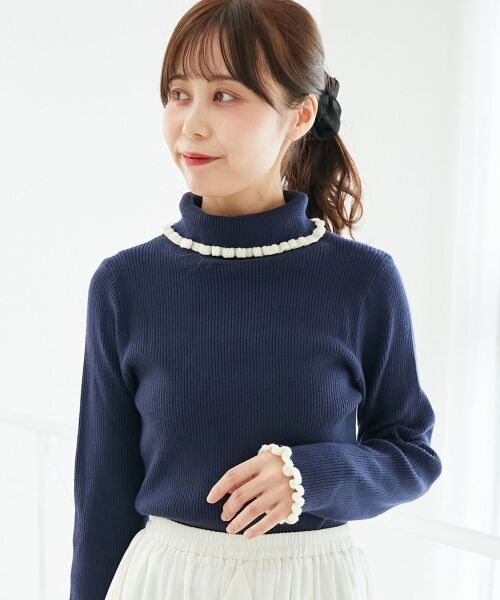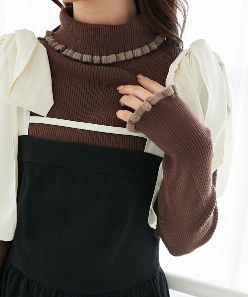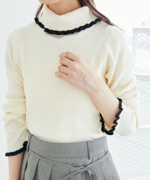 バイカラーラインのフリル部分がアクセントのタートルニット。