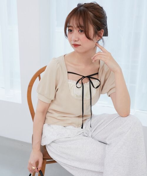 フロントのくしゅっとしたギャザーが可愛らしいドッキングカットトップス。