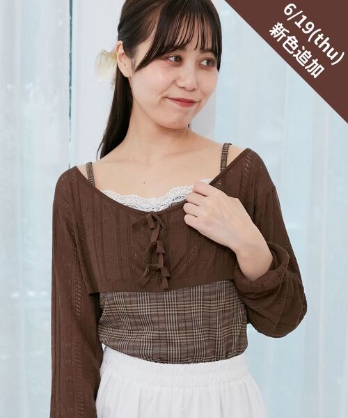 キャミソールにはレースとリボンをあしらい、1枚でも着映えするのが嬉しいポイントです。