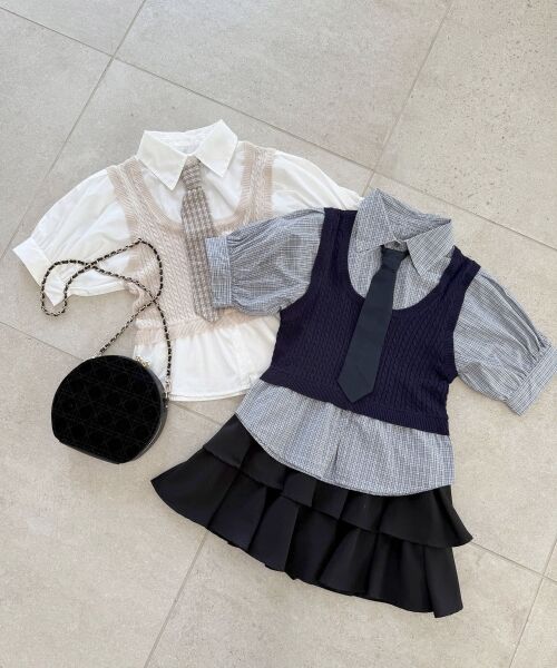 シャツ×ベストのドッキングデザイントップスにネクタイがセットになったトレンドムード溢れるアイテム。