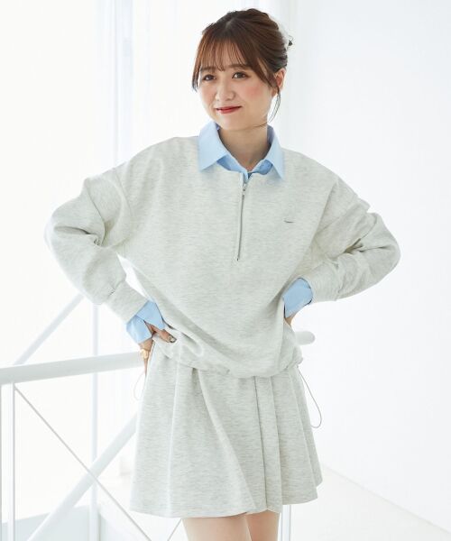 トップスは柔らかなスウェット素材と軽やかなシャツ地をドッキングしたコントラストが映えて、レイヤード風のデザインが視線を惹きつけます。