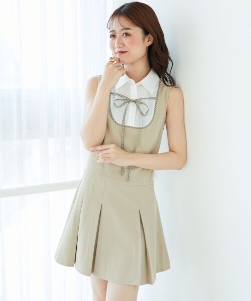 白シャツをドッキングしたデザインに、フロントのリボンをプラスすることで、顔まわりが華やかな印象に。