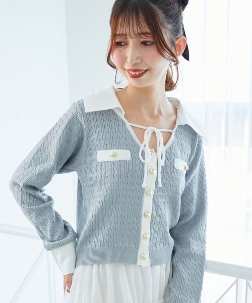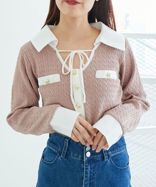 パッと目を引くバイカラーデザインと、クラシカルな布帛の襟が大人上品な一枚。