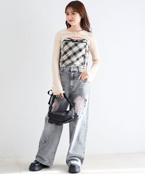 キャミソールはバイカラーのパイピングと胸元のリボンがポイントになっていて、甘すぎないガーリーさを演出します。
