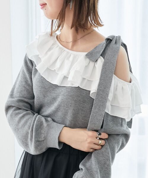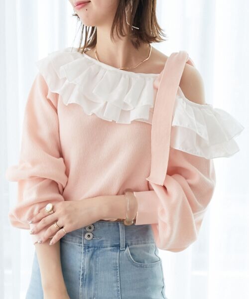 ボリューム感のあるフリルが視線を集める、ワンショル風デザインのニットトップス。