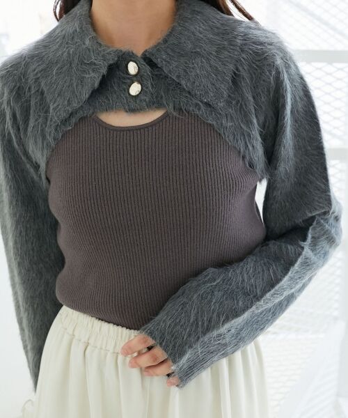 ボレロ部分はふわふわの糸を起毛させてシャギーに仕上げ、身頃部分はリブにすることでボディラインをすっきり見せ。