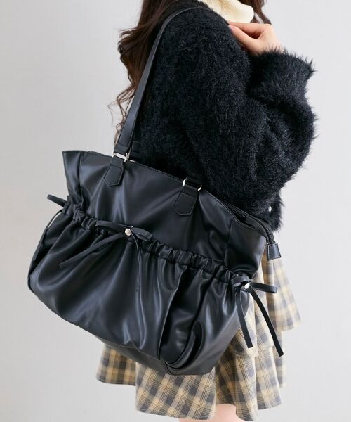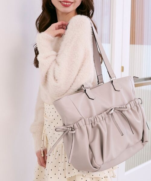 くしゅくしゅとしたギャザーと細めリボンがデザインポイントの大容量トートバック。