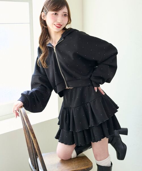 1057010127 キラキララインストーンショートパーカーとのセットアップでの着用がおすすめ。