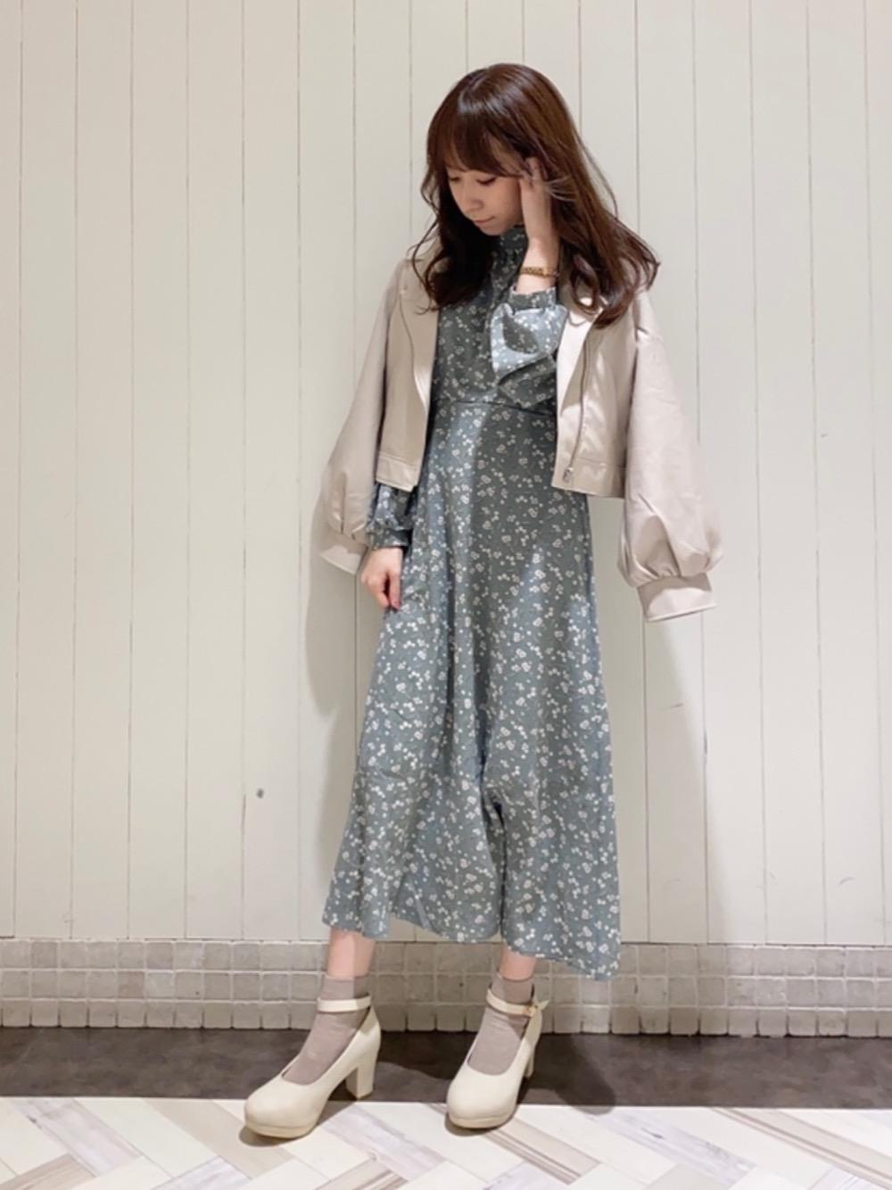 身長:156cm 【着用コメント】 花柄はやはり春を感じさせますね♡ハイネックのワンピースなので、露出が苦手な方にもオススメ♪ カラー別で、お花のデザインが雰囲気変わるので、色違いを買っても楽しめるアイテムです。