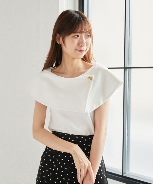 アシンメトリーになったケープのような襟のデザインが目を惹くトップス。