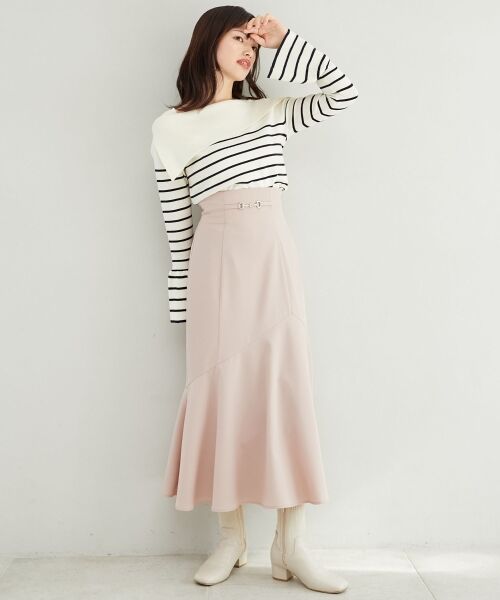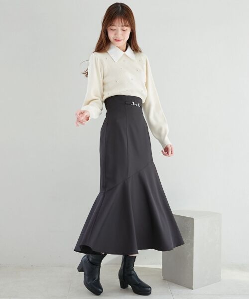 フロントにビットをあしらい、大人上品な印象に仕上げたマーメイドスカート