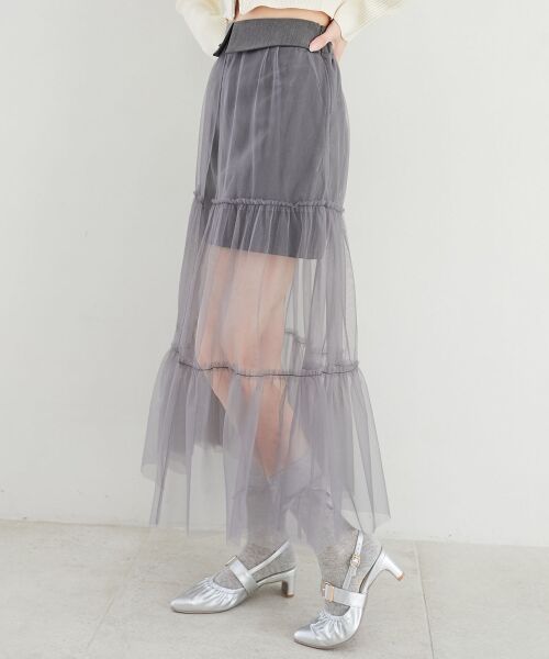 いつものミニスカートにチュールをレイヤードし、足元に抜け感をプラスしたスカート。